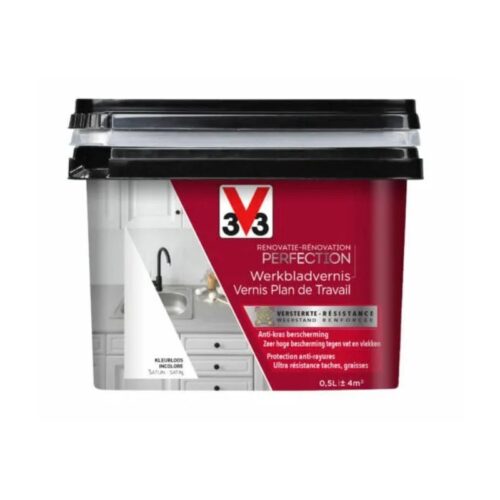 Le vernis Plans de Travail de la marque V33 a été conçu pour créer une couche de protection sur des surfaces horizontales telles que les plans de travail et les plans vasques.