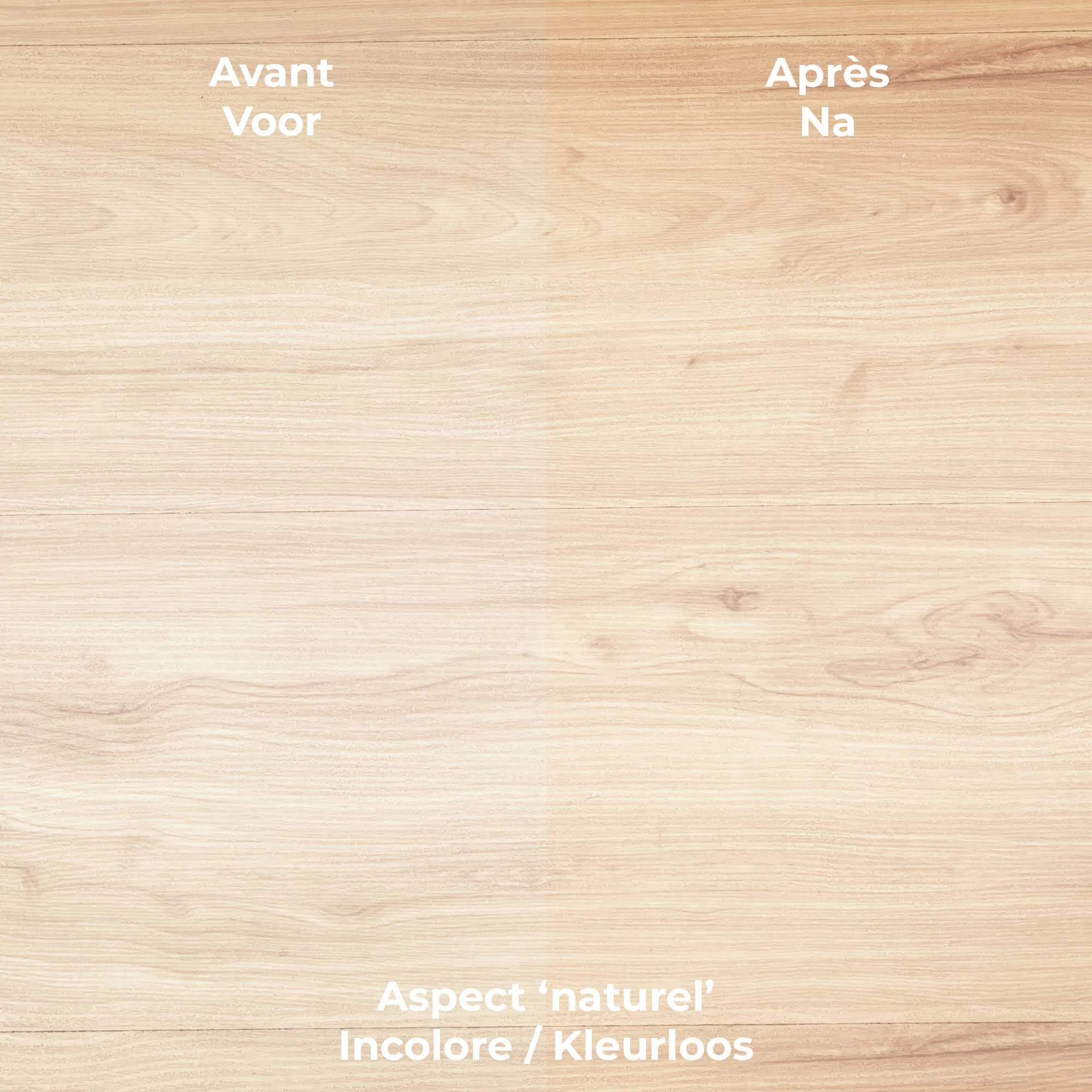 De par leur nature, les huiles même incolores (non pigmentées) peuvent influencer la teinte du bois: en nourrissant un bois brut, l’huile lui confère un aspect mouillé permanent, parfois très différent de l’aspect du bois sec, usiné, poncé. Cette réaction ne constitue en aucun cas un défaut produit et dépend de l’essence de bois. La porosité ou l’âge du bois peuvent également influencer la couleur finale. Faites un essai préalable sur une partie cachée de votre bois afin d’apprécier le résultat.