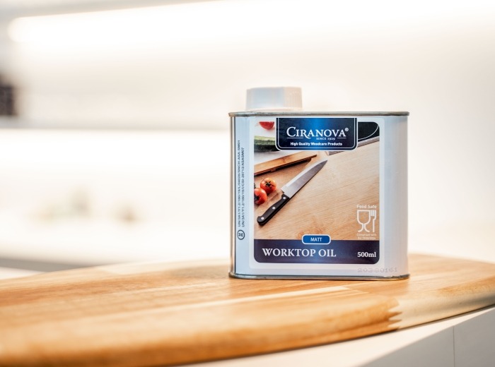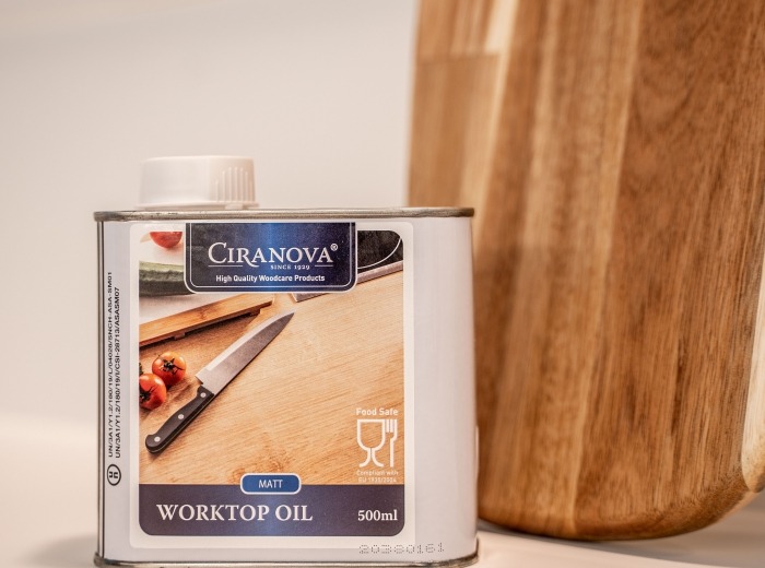 Ciranova WORKTOP OIL a été testée selon la norme 1935/2004 et, après séchage, elle est adaptée au bois qui entre en contact avec les aliments.